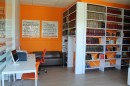 Спроектировали, изготовили и установили стационарные стеллажи для библиотеки: односторонние вдоль стен; двухсторонние в центре зала с лицевой панелью, оформленной под стиль интерьера. Для удобства пользователей добавили планки-карманы для выставочных изданий и передние ограничители, предотвращающие падение книг. В детской зоне стеллажи сделали невысокими, чтобы даже самые маленькие читатели могли самостоятельно выбирать книги.